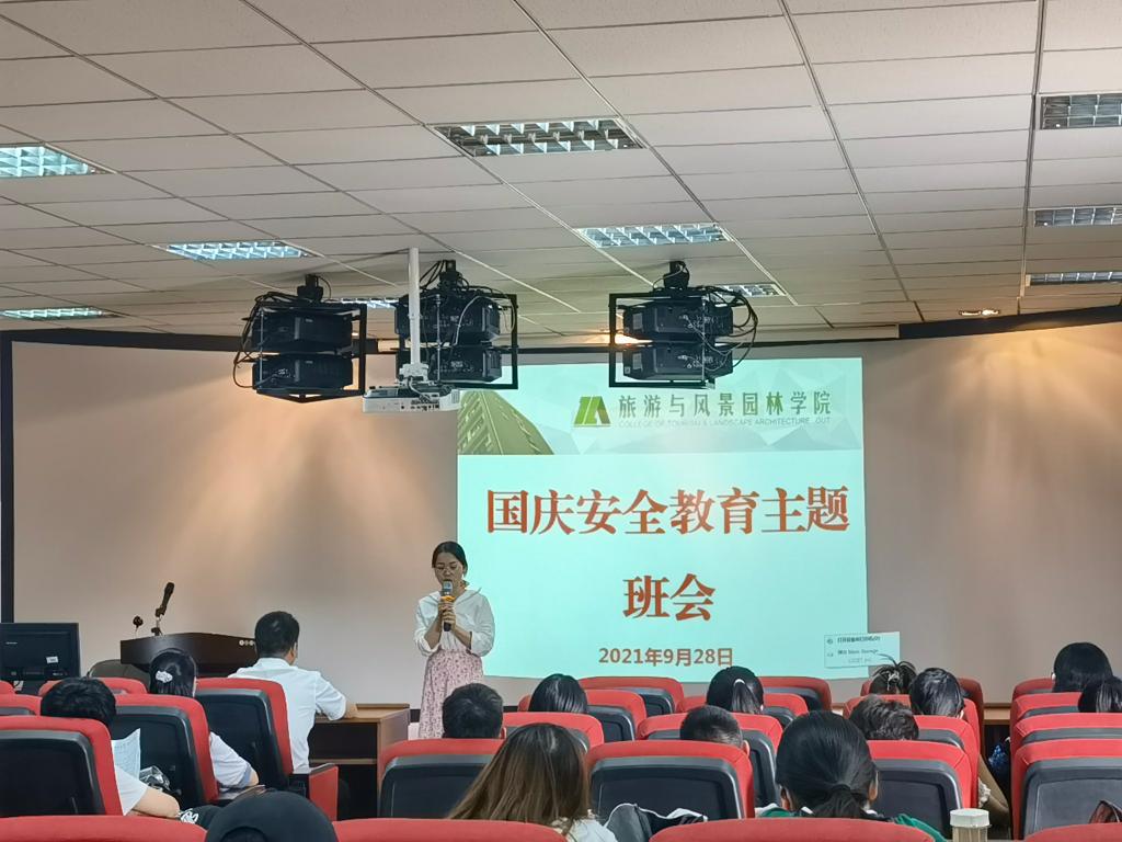 会上,辅导员黄老师就国庆假期安全问题进行强调,提醒同学们注意疫情防控,非不要不离桂。外出活动在做好请假手续的前提下注意交通、饮食安全,提高防盗、防诈骗、防溺水意识,共同度过一个愉快、安全的国庆假期。