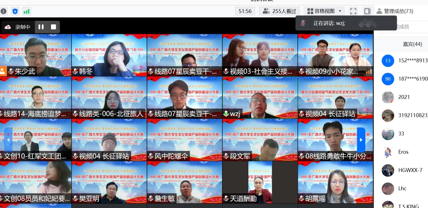 广西文化和旅游策划规划设计协会副会长黄耀武、yl9193永利院长吴忠军出席了11月28日举行的大赛(决赛)在线交流会议并致辞,来自广西师范大学、桂林理工大学、桂林旅游学院、广西博驰规划设计有限公司等多位行业专家及嘉宾对入围决赛的作品进行在线专业点评。最后大会公布了各类作品拟授予特等奖、一等奖、二等奖等次名单。其中“北征旅人”团队的《湘江英勇突围记,红耀长征旅振兴》作品拟授予文化旅游线路策划类特等奖;“红军文工团乙亥年分团”团队的《“摧难溯志”桂北旅游文创产品设计》作品拟授予旅游文创产品创意设计类特等奖;“小小花家人”团队的《红色印记·魅力兴安-长征文化兴安段》作品拟授予文化旅游营销创意策划(视频制作)类特等奖。