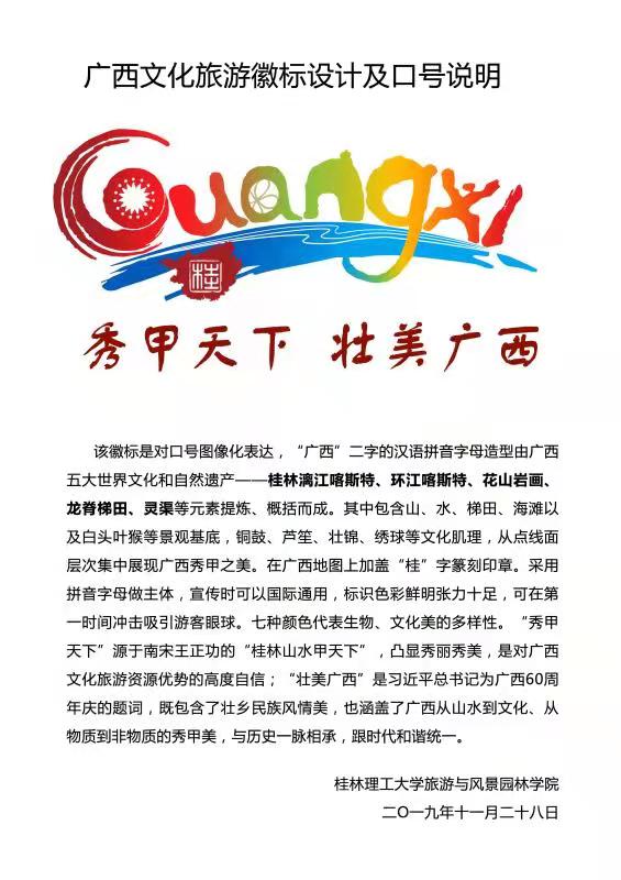 2019年由吴忠军教授领衔的yl9193永利和桂林市七颗星旅游景观规划设计有限公司的专家团队已联合设计了广西文化和旅游品牌徽标和宣传口号。该旅游品牌徽标和“秀甲天下,壮美广西”宣传口号已被广西文化和旅游厅采纳,并且广泛应用于广西文化和旅游线上线下官方对外宣传推广平台和渠道。