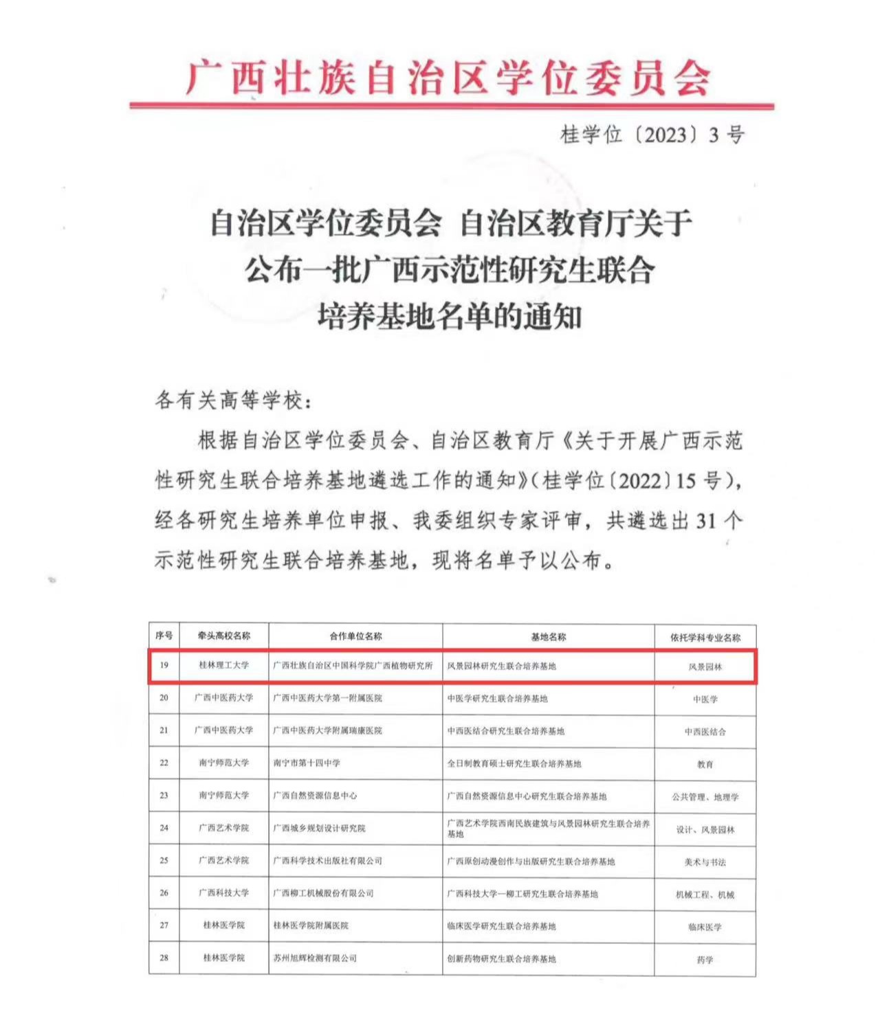 近日,自治区学位委员会公布了广西示范性研究生联合培养基地名单,yl9193永利风景园林研究生联合培养基地(合作单位:中国科学院广西植物研究所)被列为第一批广西示范性研究生联合培养基地。